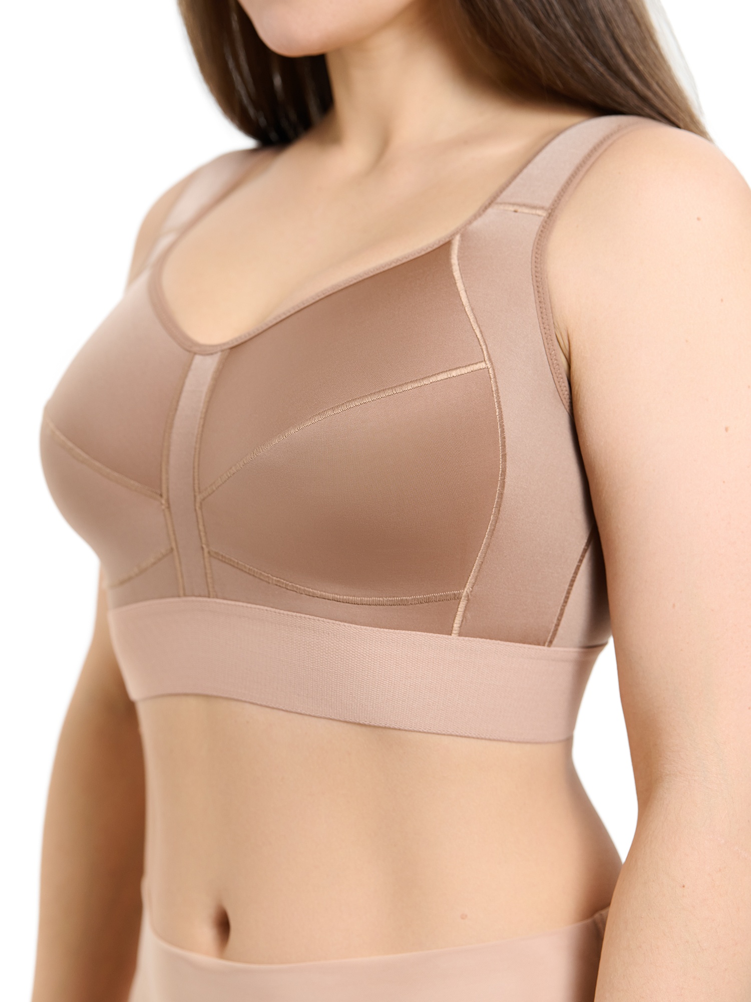 В основе конструкции закрытая сшивная чашка с усиленной боковой зоной, которая переходит в широкие эргономичные бретели.
