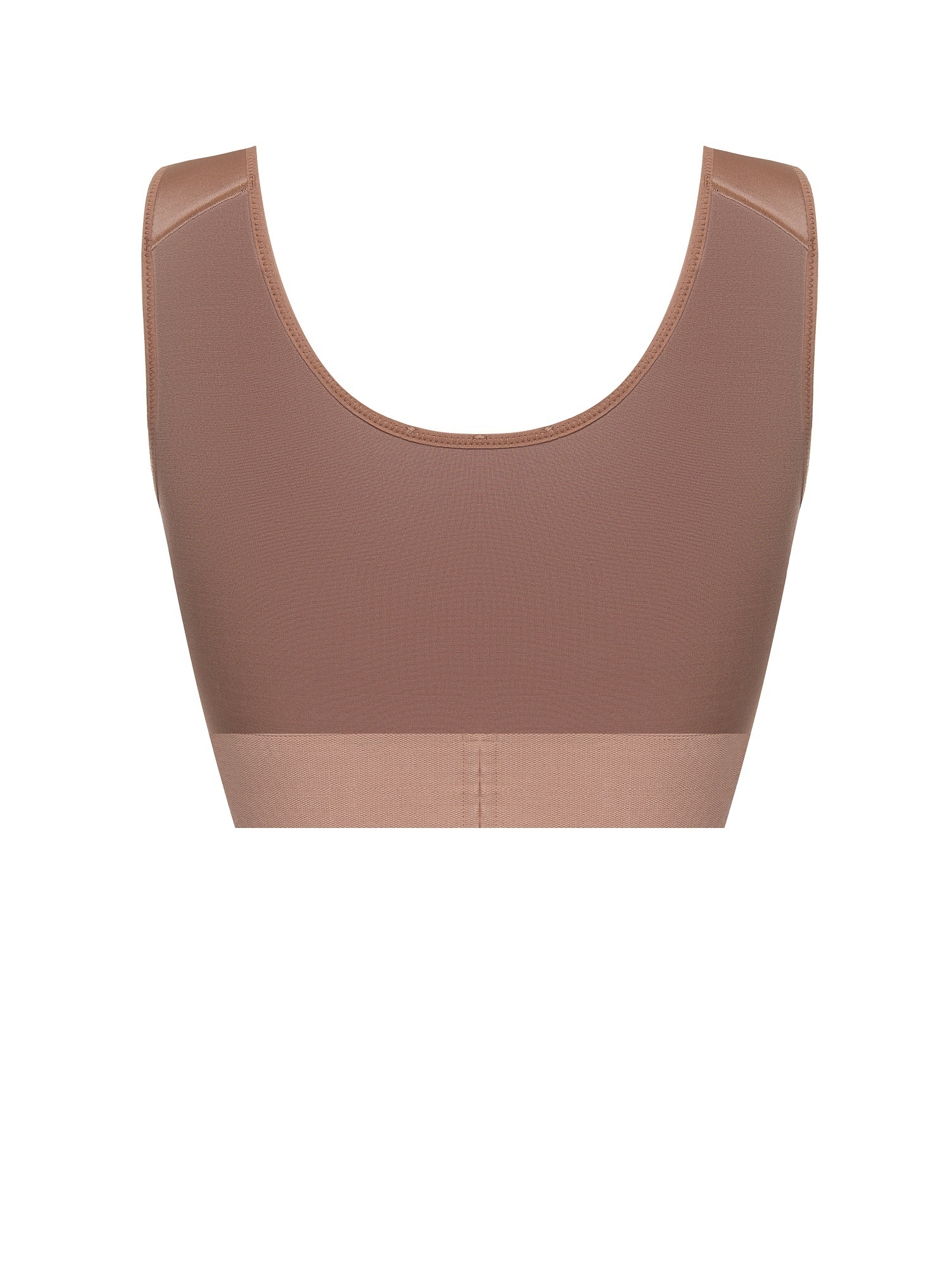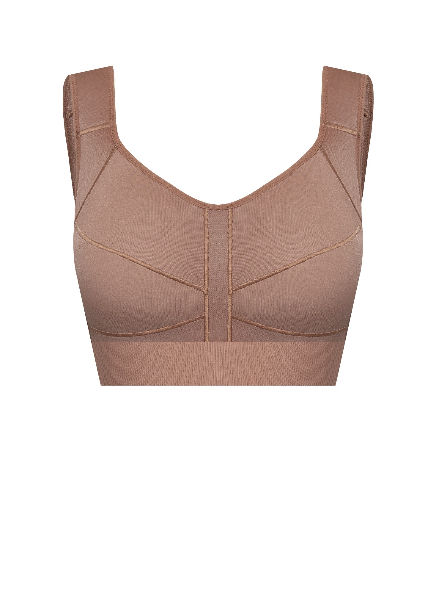 В основе конструкции закрытая сшивная чашка с усиленной боковой зоной, которая переходит в широкие эргономичные бретели.