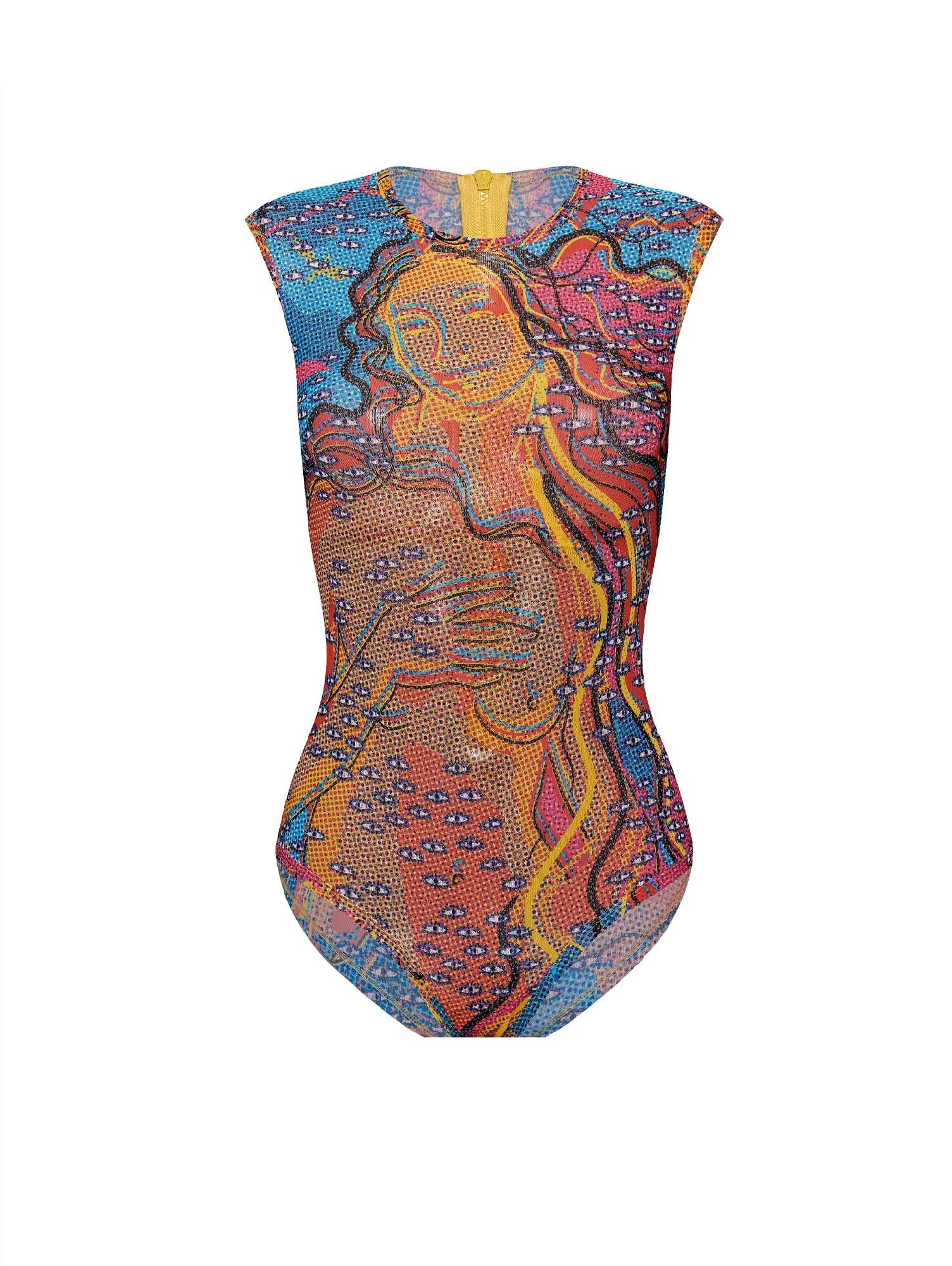 За счет материала и активного узора, купальник визуально вытягивает силуэт и скрадывает объемы.