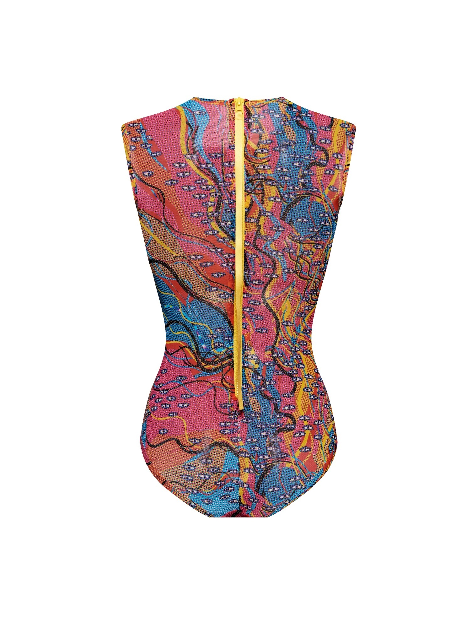 На спинке застежка в виде акцентной молнии. Низ купальника выполнен в виде классических трусов слипов.