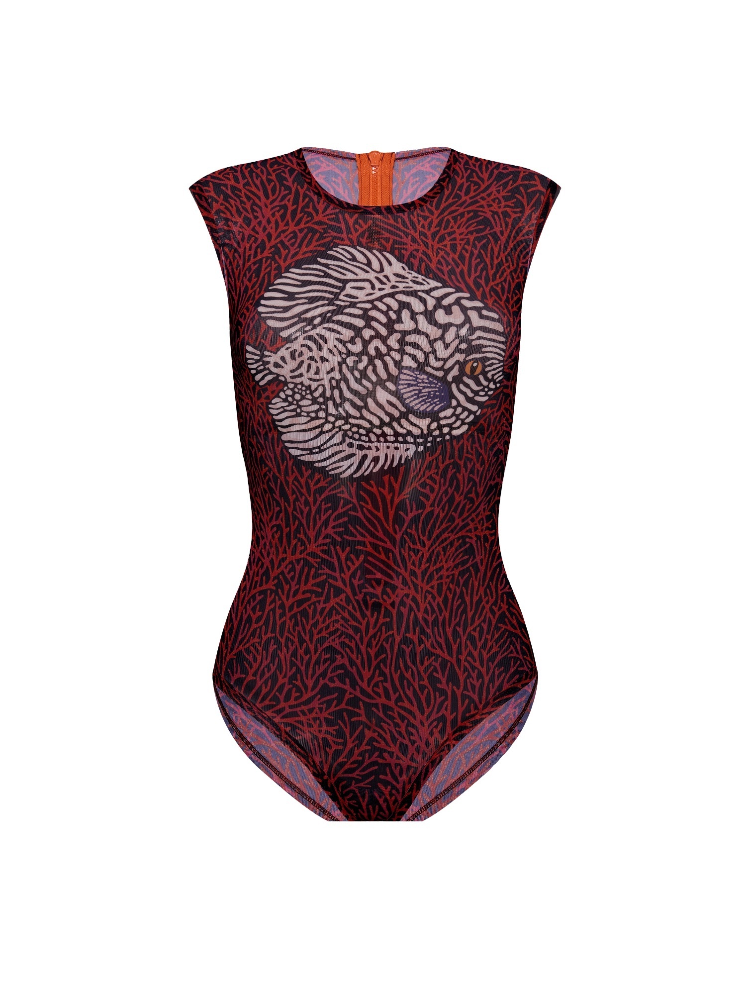 На спинке застежка в виде акцентной молнии. Низ купальника выполнен в виде классических трусов слипов.