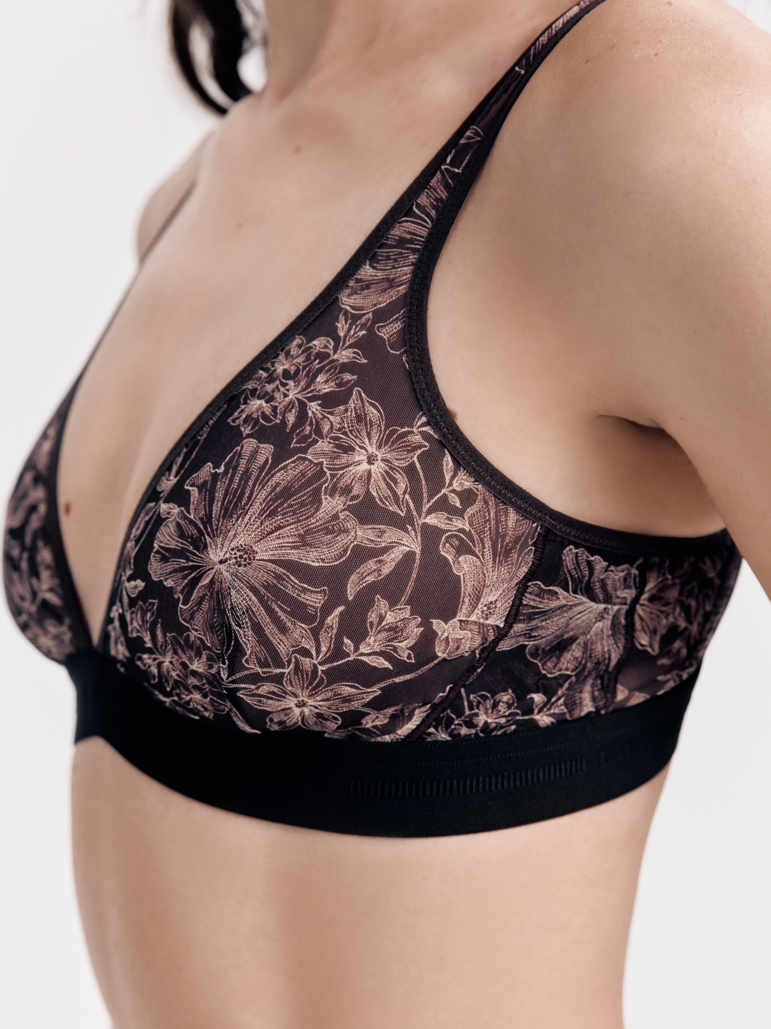 В основе конструкции удлиненные треугольные чашки с цельнокроенными бретелями и усиленная боковая зона, которая собирает грудь и обеспечивает плотную посадку.